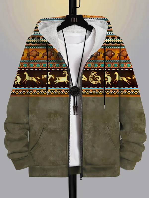 Retro Ethnic Pattern Print Men’s Hooded Jacket Casual Long Sleeve Hoodies With Zipper Gym Sports Hooded Coat For Spring Fall